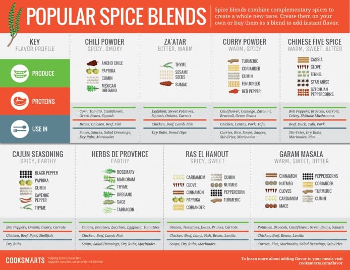You're probably familiar with the name and qualities of these nine well known blends of spices, but can you name the individual spices in each blend? For example, did you know that Garam Masala and Ras el Hanout are each made up of nine different spices or that chilli powder contains four? Traditional Herbs de Provence includes six different herby leaves that bring that classic Mediterranean flavour to meat, fish and vegetable dishes. Test your knowledge and fill in the gaps by looking at the chart of 8 popular spice blends below.