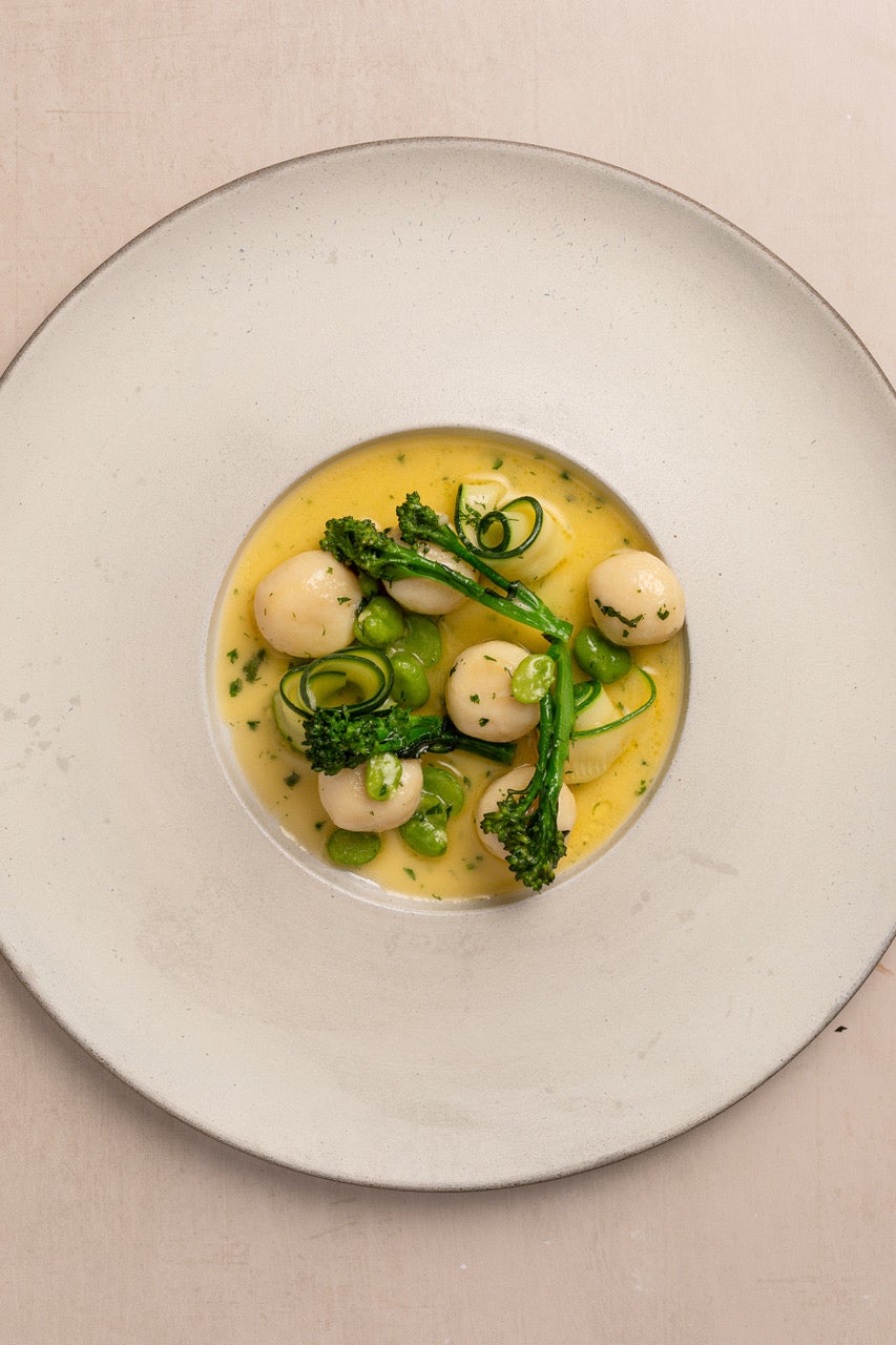 Once the gnudi are cooked, and the emulsion is thick, add lemon juice and grated parmesan to the sauce and mix well to incorporate. Fold in the spring vegetables and continue to cook until all the vegetables are hot (if the sauces becomes too thick or begins to separate add a small amount of warm water).