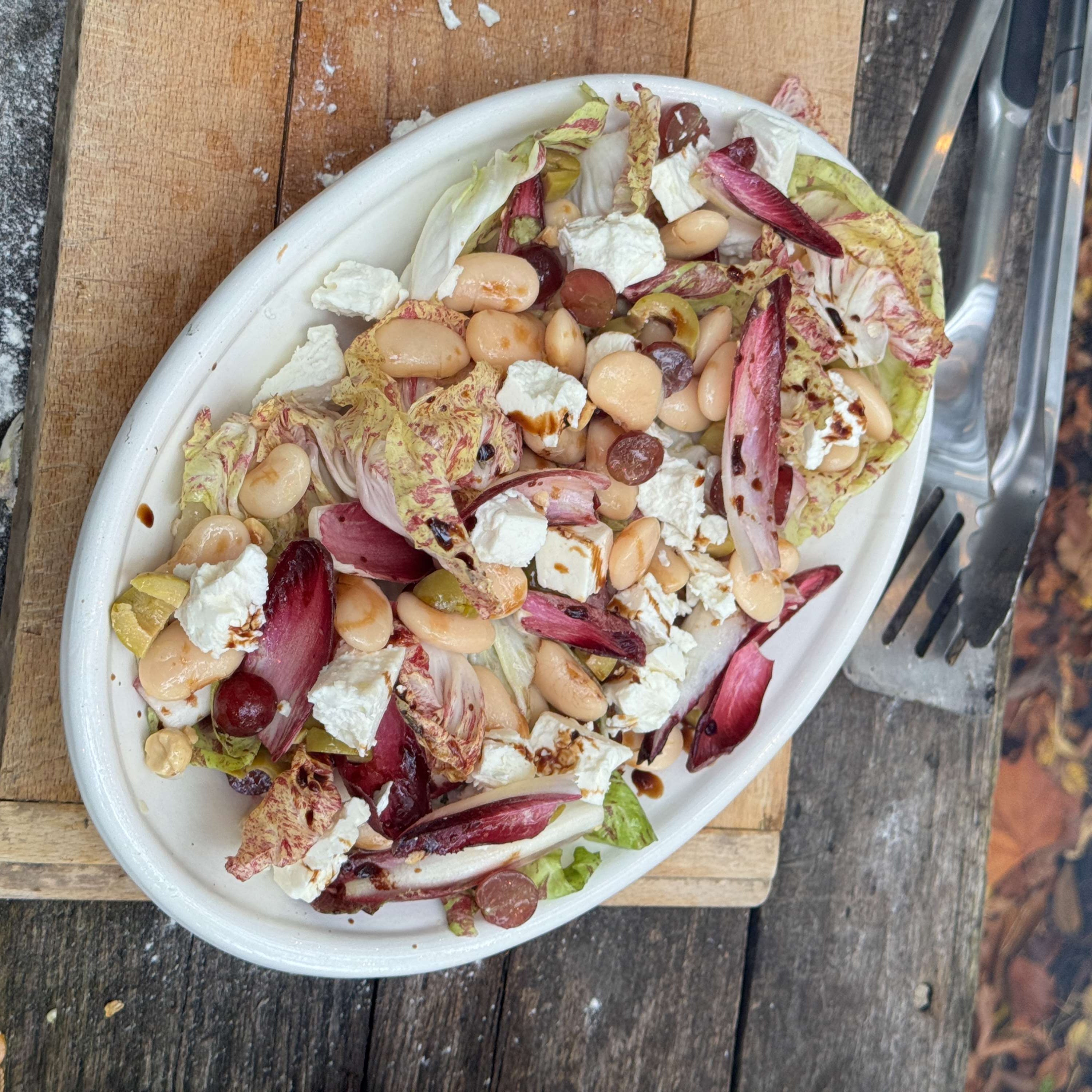 - Separate the radicchio leaves and put them in a mixing bowl. Half the grapes, olives and toasted hazelnuts, and add them to the radicchio along with the white beans. Crumble the feta but keep it separate.